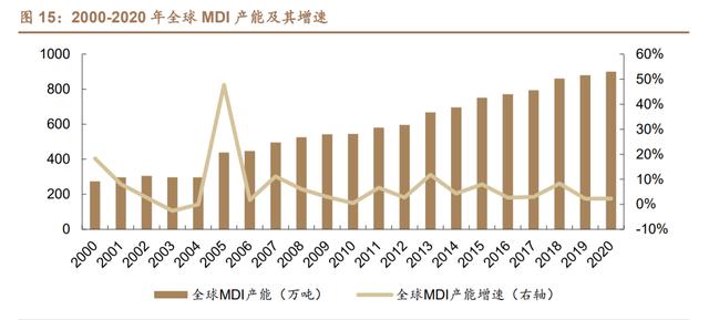 全球 MDI 产能快速增长,近 20 年 CAGR 达 7%。近 20 年来,全球聚氨酯工业发展迅猛,已成为化学工业中增长最快的行业。2000 年,全球 MDI 产能仅 275 万吨,2020 年达到 900 万吨,2000-2020 年复合增速达 7%。2020 年全球 MDI 产能新增 20 万吨:来自科思创德国布伦斯比特工厂 MDI 装置的技改扩能;全球 MDI 装置整体运行情况良好,产量约为 735 万吨,平均开工率在 83%左右,相比 2019 年整体负荷基本持平。