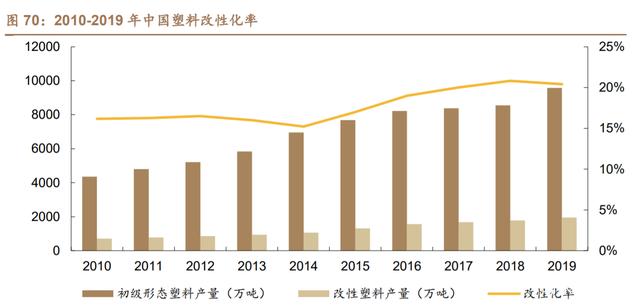 国内塑料改性化率不断提高,市场需求广阔。2010 年,国内改性塑料产量仅为 705 万吨,改性化率为 16.17%。在“十三五”等政策助力下,国内改性塑料行业迎来了发展良机。2019 年,国内改性塑料的产量已增加至 1955 万吨,CAGR 达 12%,改性化率提升至 20.42%;据前瞻产业研究院测算,到 2024 年国内塑料改性化率有望达到 30%。同时,中国目前的塑钢应用比只有约 30∶70,远低于发达国家(70∶30)和世界(50∶50)平均水平。考虑到中国改性塑料行业起步较晚以及受生产技术所限,国产改性塑料在制造业的应用比例偏低。随着国内改性塑料技术的不断提高,未来国内对改性塑料的需求将显著提升。