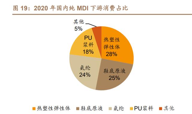 国内纯 MDI 下游主要应用领域为热塑性弹性体(28%)、鞋底原液(25%)、氨纶(24%),聚合 MDI 下游主要应用领域为冰箱冰柜(48%)。2020 年,国内纯 MDI 消费量 98 万吨,热塑性弹性体和鞋底原液的消耗合计超过总消耗的一半,合计 53%。2020 年,国内聚合 MDI 消费量为 122 万吨,主要用于白色家电的生产、建筑相关的使用和汽车空调的消费。其中白色家电占比高达 48%,主要终端应用是家用冰箱和家用冰柜。