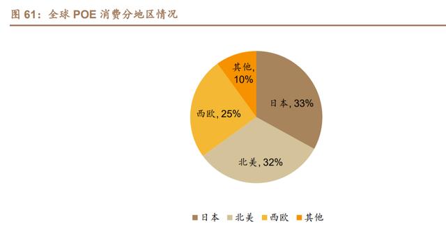 POE 广泛应用于医用包装材料、汽车配件、日用制品等领域。POE 优异的性能使其既可用作橡胶,又可用作热塑性弹性体,还可用作塑料的抗冲改性增韧剂。 POE 可应用于不同产品,如汽车挡板、柔性导管、输送带、印刷滚筒、运动鞋、电线电缆、汽车部件、耐用品、挤出件、压模件、密封材料、管件和织物涂层等,也可以作为低温抗冲改良剂来改善 PP 的低温抗冲性能,同时可以作为热塑性弹性体运用于汽车领域,已成为替代传统橡胶和部分塑料的极具发展前景的新型材料之一。