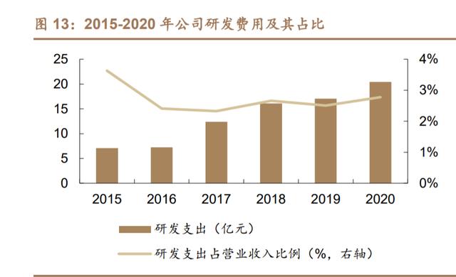 持续进行研发投入,打造全产业链研发创新核心竞争力。公司研发支出从 2015 年的 7.07 亿元上升至 2020 年 20.43 亿元,近年来研发支出占营业收入的比例保持在 2.5%左右。同时,公司研发人员储备充足,2020 年研发人员占员工人数比例 15.8%。其在研发方面的大量投入进一步验证公司对于科研技术的重视程度,并为公司带来了巨大的科研回报和技术优势。