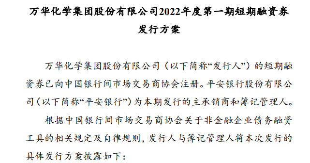 1.债务融资工具名称:万华化学集团股份有限公司2022年度第一期短期融资券。