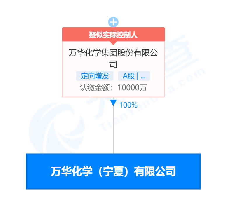 根据天眼查信息显示,3月10日,万华化学(宁夏)有限公司成立,法定代表人为刘军昌,注册资本1亿元人民币,注册地址为宁夏宁东能源化工基地企业总部A座15层A1501-05室,经营范围包含:专用化学产品制造(不含危险化学品);塑料制品制造;工程塑料及合成树脂销售等。企查查股权穿透显示,该公司由万华化学100%控股。