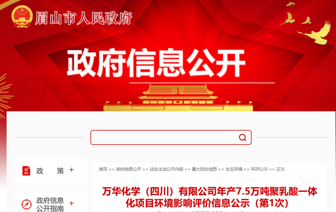 3月22日,眉山市人民政府对万华化学(四川)有限公司年产7.5万吨聚乳酸一体化项目环境影响评价信息进行了第一次公示。