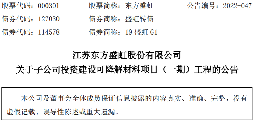 江苏东方盛虹股份有限公司(以下简称“公司”)为进一步丰富产业链,优化调整产品结构,提高产品附加值,提高企业综合竞争实力和盈利能力,公司的三级控股子公司连云港虹科新材料有限公司(以下简称“虹科新材料”)拟投资建设可降解材料项目(一期)工程(以下简称“本项目”)。本项目总投资74.71亿元,项目工程建设期为3年。