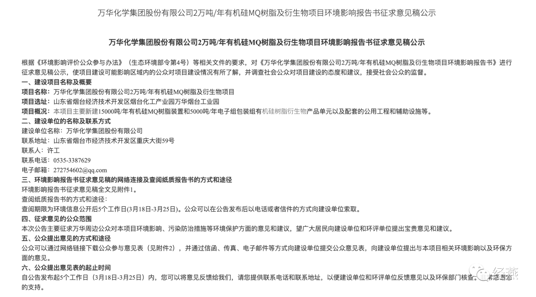 近日,万华化学在其官网上公示了2万吨/年有机硅MQ树脂及衍生物项目环境影响报告书征求意见稿,该项目主要新建15000吨/年有机硅MQ树脂装置和5000吨/年电子组包装组有机硅树脂衍生物产品单元以及配套的公用工程和辅助设施等,公示期为3月18日-3月25日。