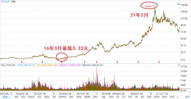 从上图可以看出万华16-21年,股价从最低点3.33元涨到最高点148.88元,涨幅超过40倍,远超业绩涨幅。