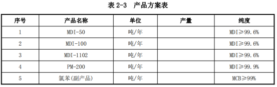 产品方案:项目主要分离MDI产品,包括MDI-50、MDI-100、MDI-1102、PM-200及副产品氯苯。
