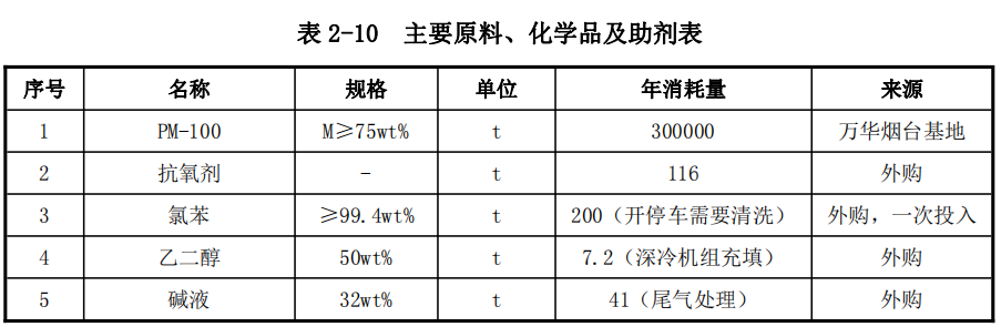 项目建设内容:建设规模为30万吨/年,分离MDI产品,以万华化学集团股份有限公司烟台生产基地运输的MDI与PM混合物(以下简称PM-100)为原料,通过精馏工艺分离出纯MDI和聚合MDI两大类产品以满足周边市场需求。
