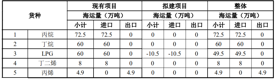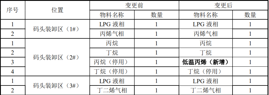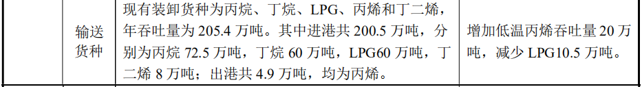 装卸货种及吞吐量情况:丙烯货种常温装卸吞吐量 4.9 万吨/年不变,新增低温丙烯设计吞吐量 20 万吨/年,同时减少 LPG 货种 10.5 万吨/年,本项目建成后码头 103 号泊位吞吐量由 205.4 万吨增加至 214.9 万吨。