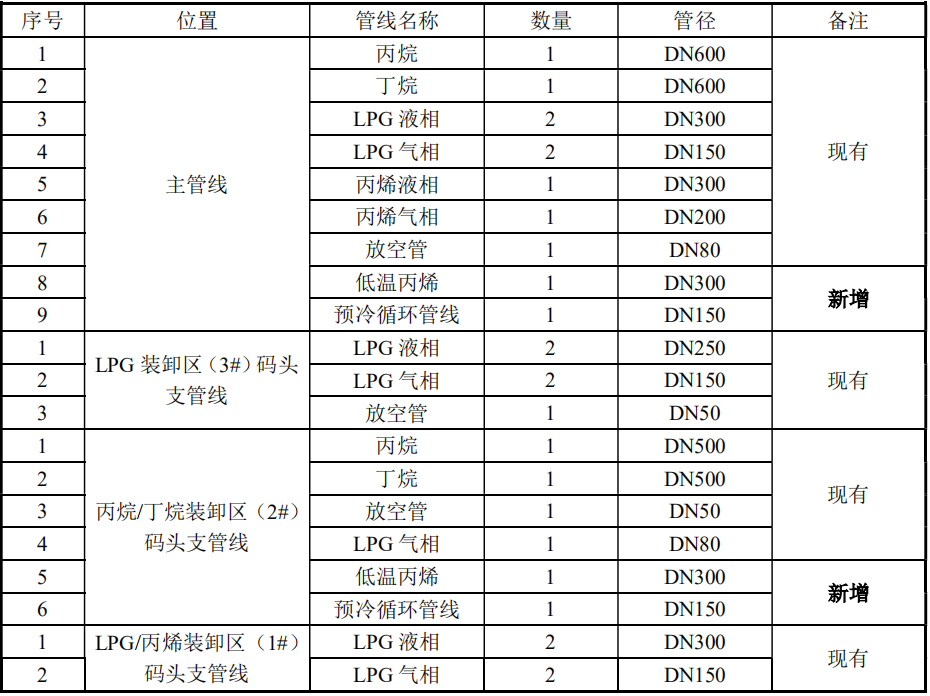 本次103号泊位增加丙烯吞吐量及配套管线工程拟在103号泊位利用原有闲置丙烷装卸臂 1 台,新增 2 台低温丙烯增压泵,新增低温丙烯装卸吞吐量,并依托现有管廊新增 1 条 3.0km 低温丙烯装卸船管线 DN300 和 1 条 3.0km 预冷循环管线 DN150 至万华工业园界区。