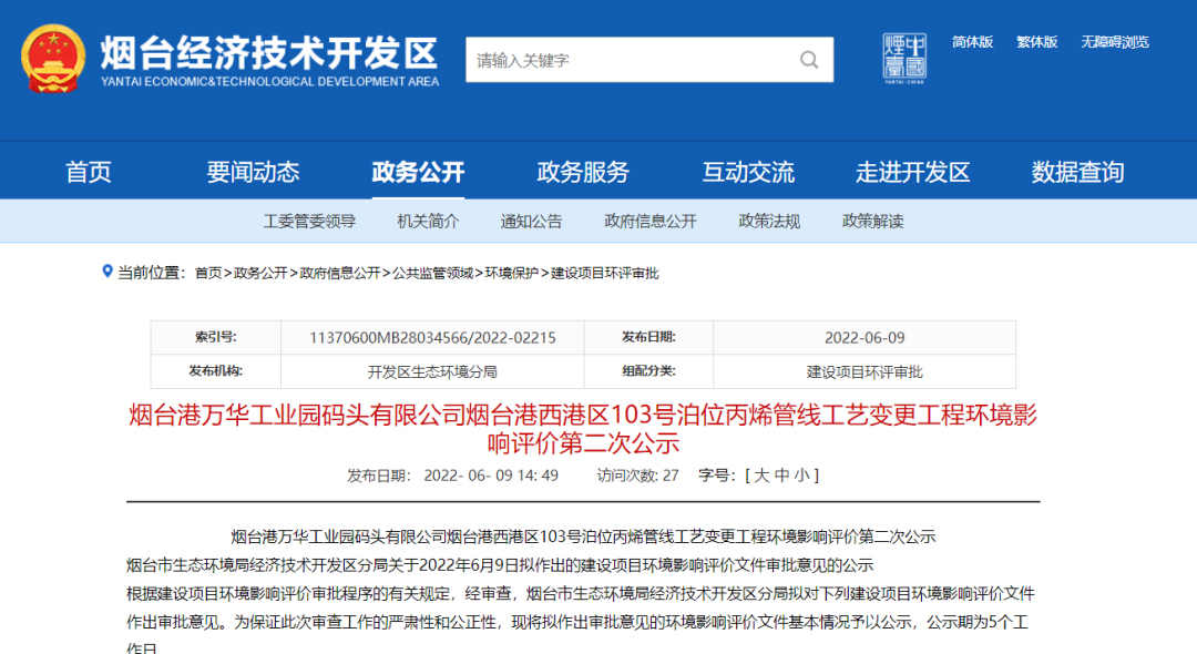 泊位改造!助力烟台港工业园多个化工项目6月9日,烟台港万华工业园码头有限公司"103号泊位增加丙烯吞吐量及配套管线工程"进行环评二次公示。