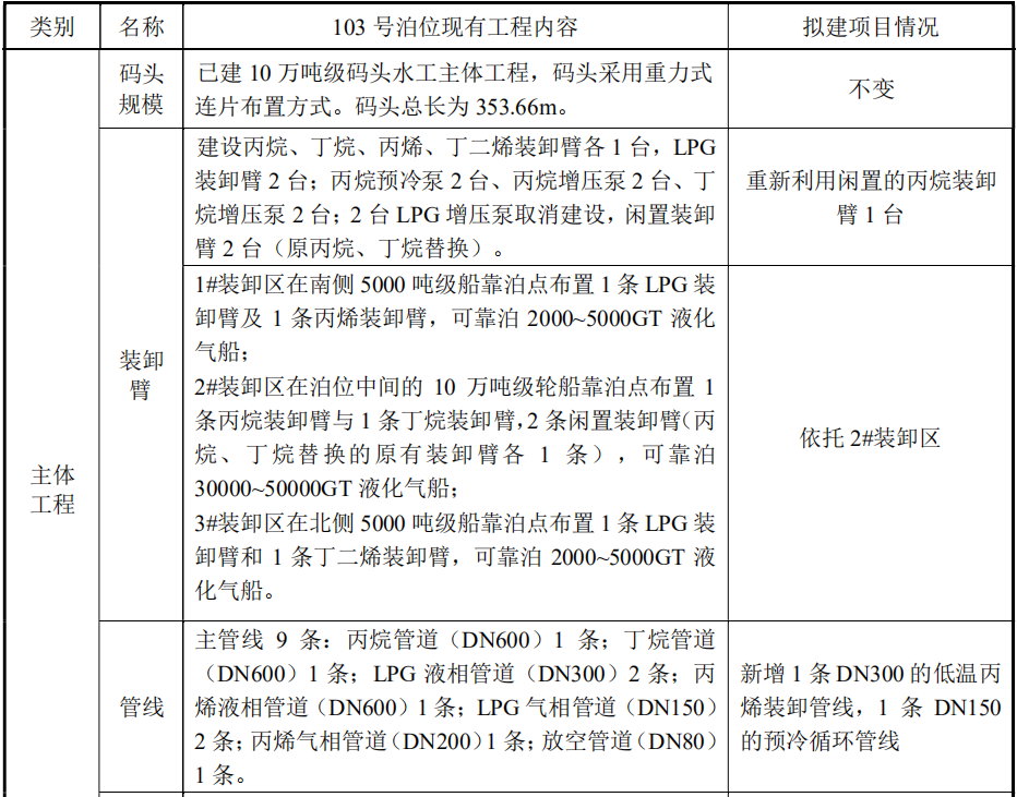 103 号泊位增加丙烯吞吐量及配套管线工程内容包括两部分:一是将泊位原有闲置的装卸臂重新利用,并增加 2 台低温丙烯增压泵,新增低温丙烯装卸吞吐量;二是新增低温丙烯管道。