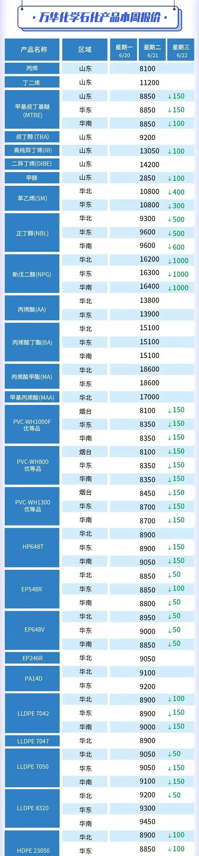 6月21日,万华化学发布本周最新报价单,其中超过70%的化工产品价格均出现下跌情况,如丁二烯、新戊二醇、正丁醇、PVC等,其中新戊二醇最高跌1000元/吨!