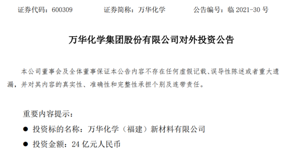 2021年3月24日,万华化学发布对外投资公告:按照万华化学集团股份有限公司持股80%、宁波中韬投资股份有限公司持股20%比例,成立合资公司—万华化学(福建)新材料有限公司(以下简称“福建新材料公司”),注册资本金30亿元人民币,其中万华化学出资24亿人民币,双方将以现金方式出资。
