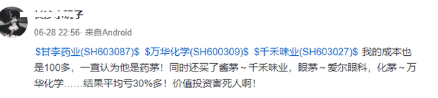 在网上,有股民写道:“……同时还买了酱茅~千禾味业,眼茅~爱尔眼科,化茅~万华化学……结果平均亏30%多!”
