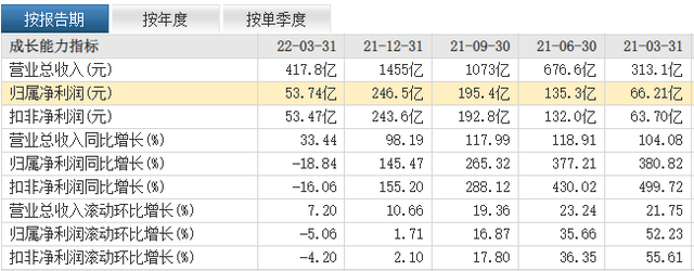 在万华化学最新披露的2022年一季报中,它实现营业总收入为417.8亿元,同比增长33.44%;归母净利润为53.74亿元,同比下滑18.84%。业绩自去年高速增长后,再次出现了下滑的局面。