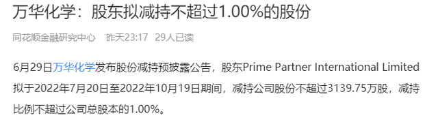 6月29日万华化学披露的股东预减持公告显示,股东Prime Partner International Limited拟于2022年7月20日至2022年10月19日期间,减持公司股份不超过3139.75万股,减持比例不超过公司总股本的1.00%。