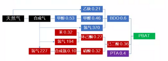 图生产1吨PBAT所需的原料配套(产品后的数字表示单耗:吨,氢气单位:方/吨)