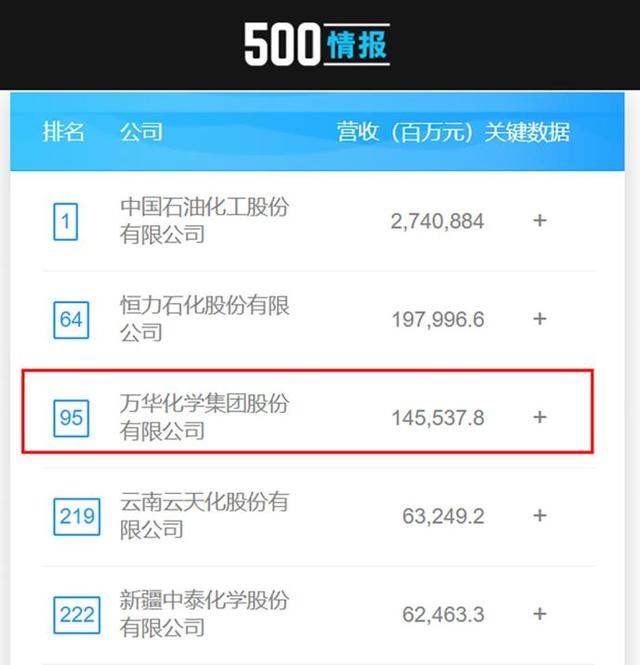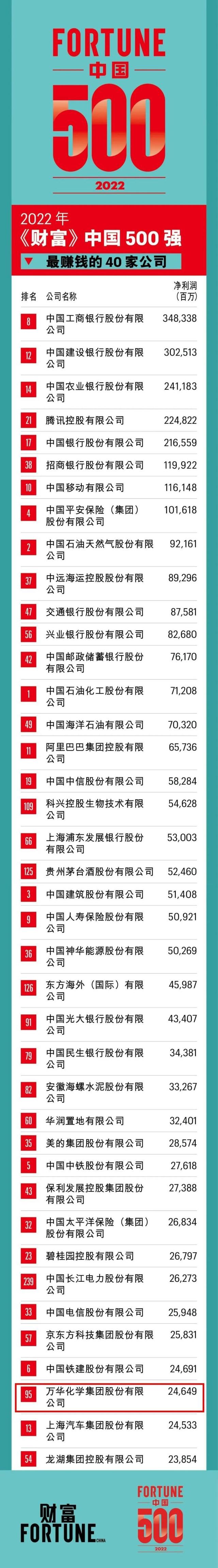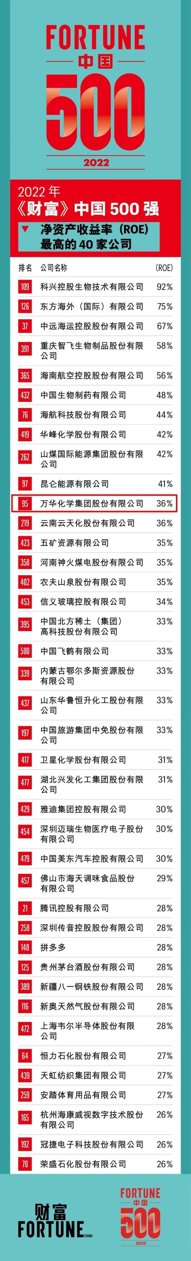 7月12日,2022年的《财富》中国500强榜单揭晓,考量了全球范围内最大的中国上市企业在过去一年的业绩和成就。其中,万华化学营业收入排名第95位,净利润排名38位,净资产收益率排名11位,化工行业排名第3位,成为2022年《财富》中国500强中最赚钱的、净资产收益率最高的40家公司之一。