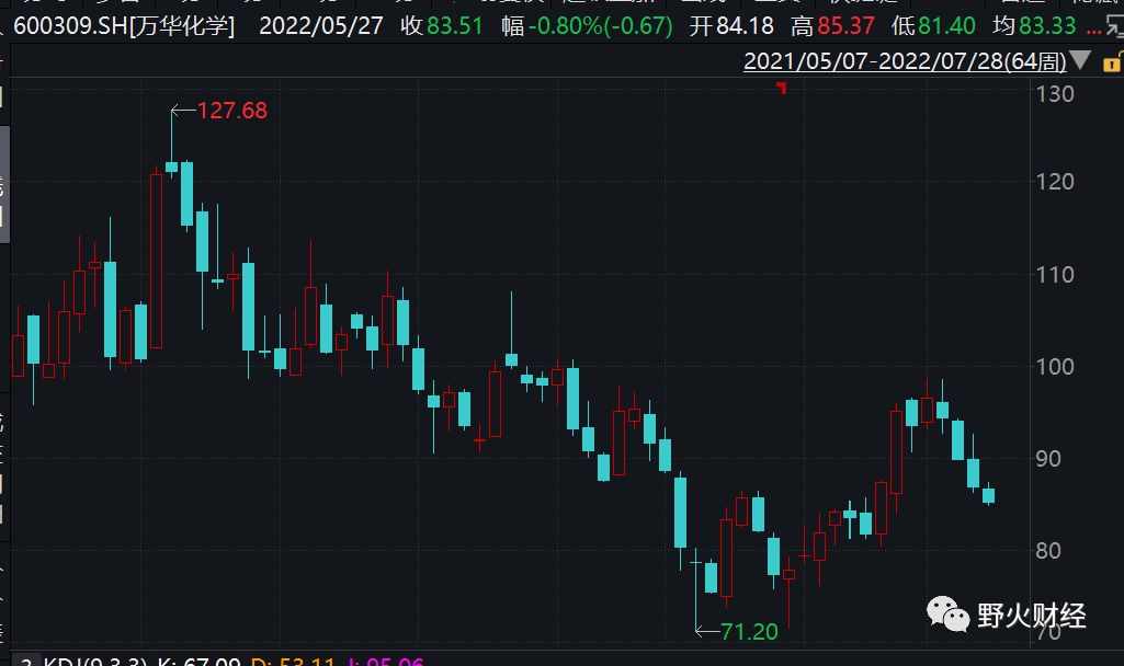 截至7月28日收市,万华化学市值2673亿元,股价85.15元,和大约一年前的127.68元以上大幅下滑大约1/3,市值蒸发掉大约1300亿元。