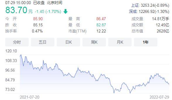 7月28日晚,“化工茅”万华化学(600309.SH)率先发布2022年中报,净利润大跌,7月以来震荡下跌的公司股价继续下探。7月29日,万华化学报收83.7元/股,跌1.7%。