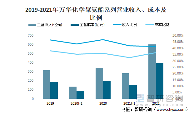 2019-2021年万华化学聚氨酯系列营业收入、成本及比例