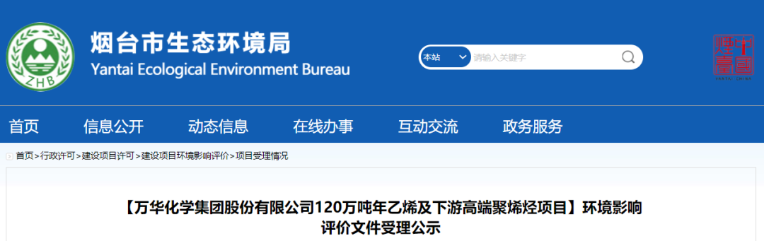 9月7日,万华化学120万吨/年乙烯及下游高端聚烯烃项目进行环评文件受理公示。