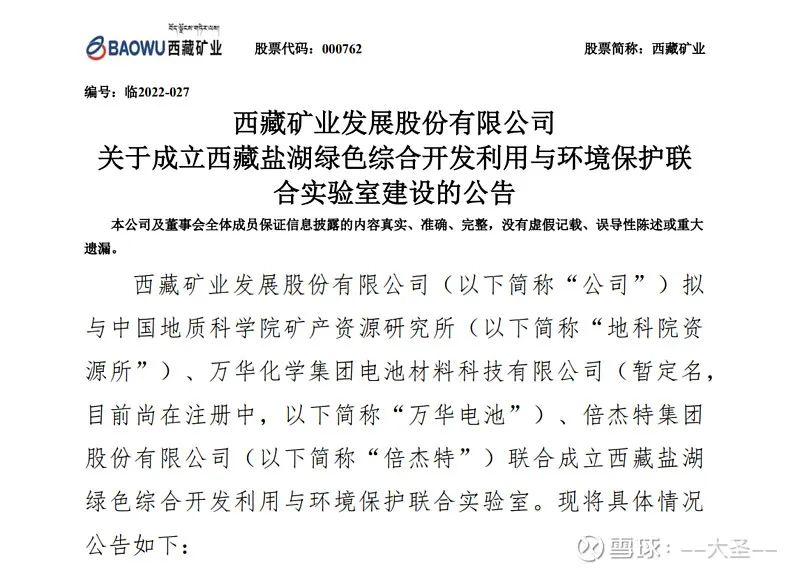 11月15日,西藏矿业公告称,公司拟与中国地质科学院矿产资源研究所、万华化学集团电池材料科技有限公司、倍杰特联合成立西藏盐湖绿色综合开发利用与环境保护联合实验室。