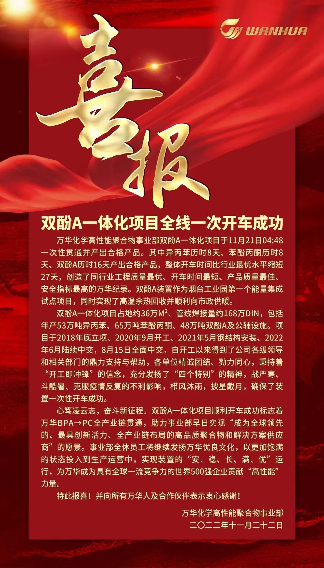 双酚A一体化项目于2018年底立项、 2020年9月开工、 2021年5月钢结构安装、 2022年6月陆续中交, 8月15日全面中交。项目顺利开车成功标志着万华BPA-PC 全产业链贯通,助力万华高性能聚合物事业部早日实现“成为全球领先的、最具创新活力、全产业链布局的高品质聚合物和解决方案供应商”的愿景。
