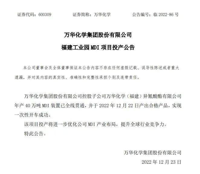 万华化学发布公告,公司控股子公司万华化学(福建)异氰酸酯有限公司年产40万吨MDI装置已全线贯通,并于2022年12月22日产出合格产品,实现一次性开车成功。