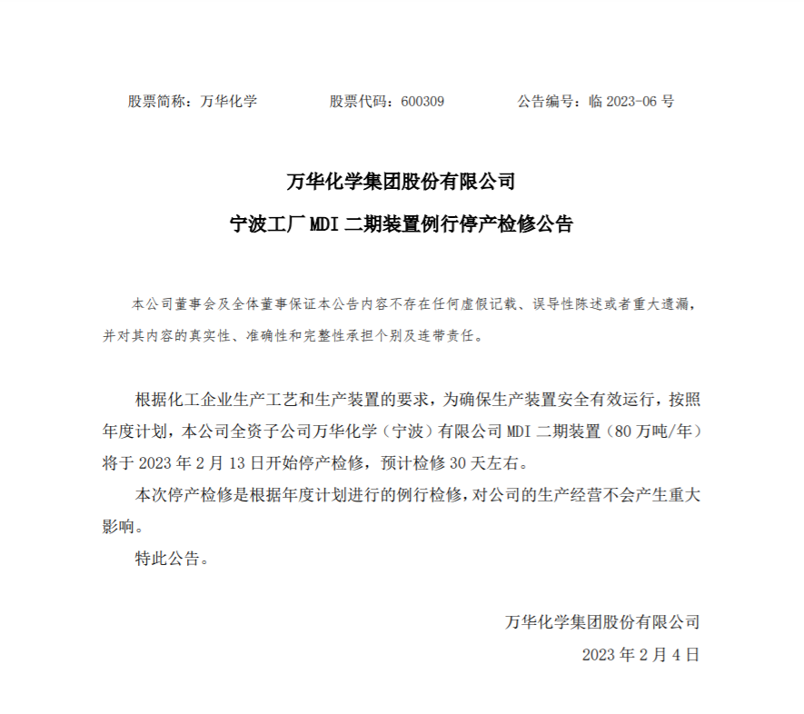 根据化工企业生产工艺和生产装置的要求,为确保生产装置安全有效运行,按照年度计划,本公司全资子公司万华化学(宁波)有限公司 MDI 二期装置(80 万吨/年)将于 2023 年 2 月 13 日开始停产检修,预计检修 30 天左右。