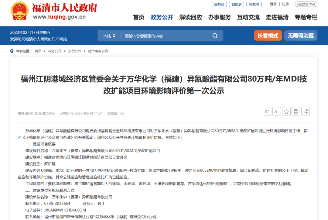 2月14日,福清市人民政府发布了万华化学(福建)异氰酸酯有限公司80万吨/年MDI技改扩能项目环境影响评价第一次公示信息。
