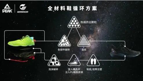 全材料鞋底循环方案是利用聚氨酯材料反应成型技术,将破碎后的废旧中底材料再加工并制成新的中底。当下仅有一小部分塑料废物可以实现回收利用,穿坏的鞋子在多数情况下都会被直接遗弃、焚烧,该方案充分利用聚氨酯材料优异的粘接及发泡性能并结合高效一体成型的反应技术,实现了废旧材料处理过程与新制品生产过程的统一,使得材料一次又一次100%循环,全流程高效便捷。