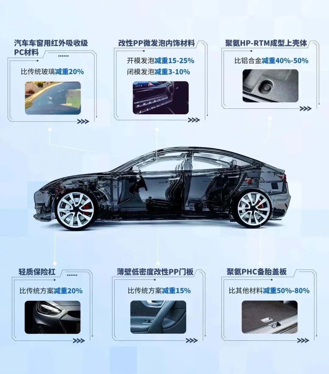 为了确保长续航里程的实现,电动汽车的减重变的更为重要。在轻量化方向,如改性PP微发泡内饰材料、薄壁低密度改性PP门板、汽车车窗用红外吸收级PC材料、聚氨酯HP-RTM成型电池包上壳体、轻质保险杠、聚氨酯PHC备胎盖板的使用,可以平均降低20%-50%的零部件重量,有效提升轻量化。