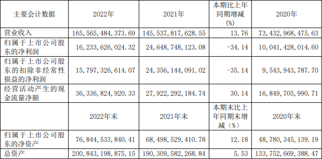 根据报告上的内容显示,2022年公司实现销售收入1,655.65亿元,同比增加13.76%;实现归属于上市公司股东的净利润162.34亿元,同比减少34.14%;每股收益5.17元,同比减少34.14%。