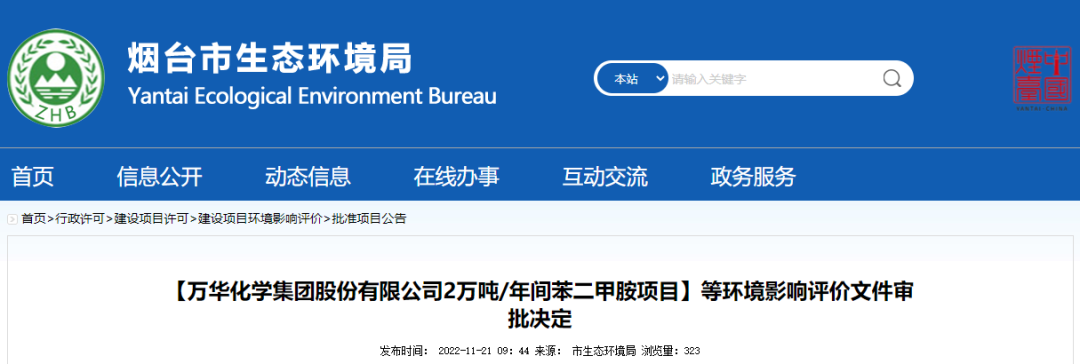 2022年11月21日,烟台市生态环境局对万华化学2万吨/年间苯二甲胺项目及特种异丁烯衍生物项目环评作出审批决定公告。