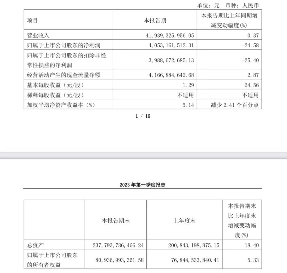 根据公告,公司实现营业收入419.39亿元,同比增长0.37%;归属于上市公司股东的净利润40.53亿元,同比减少24.58%。