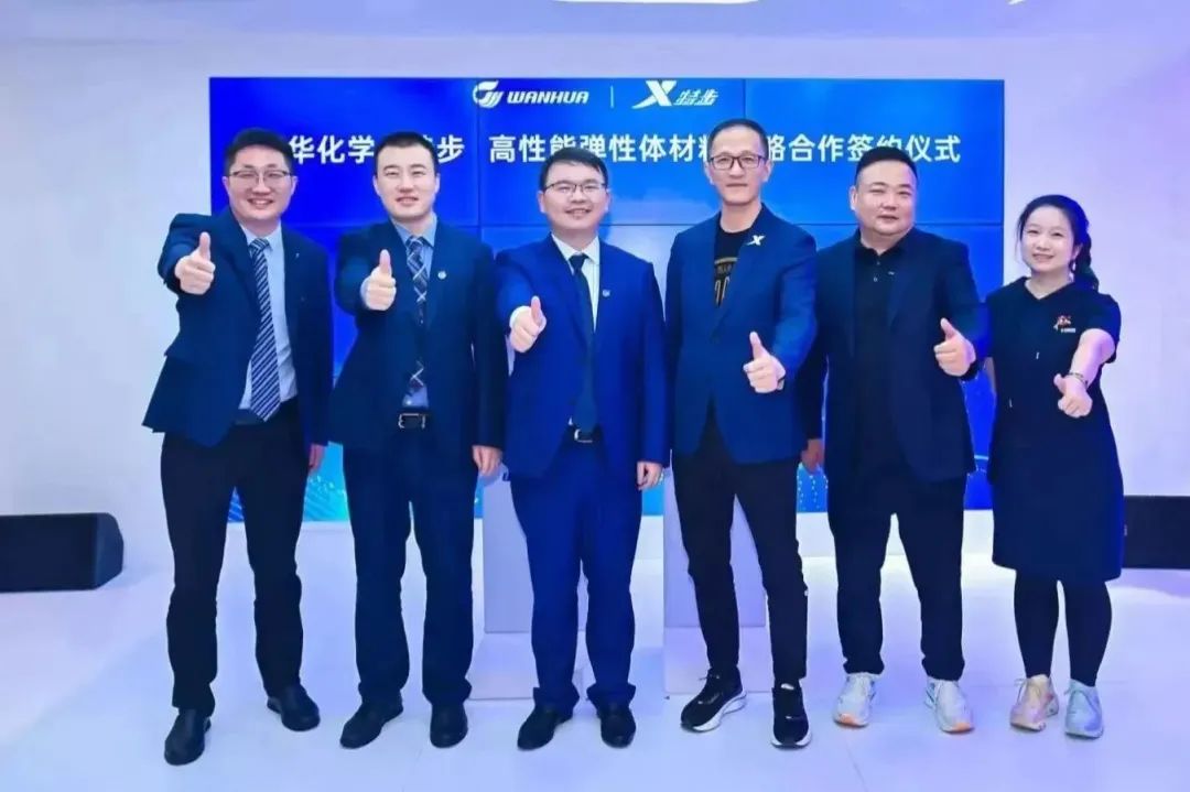 万华化学携手特步集团在CHINAPLAS 2023现场共同签署战略合作协议,携手探索高性能弹性体鞋材创新解决方案,并以环保低碳理念为鞋材行业二度赋能。
