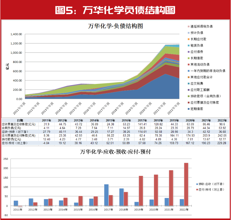 通过万华化学的负债结构图(见图5)看到,万华化学的主要负债是短期借款、应付票据及应付账款和长期借款。应付票据及应付账款是无息借款,相当于无偿地占有下游货款,是万华化学对下游的议价能力和产业链强势地位的体现。