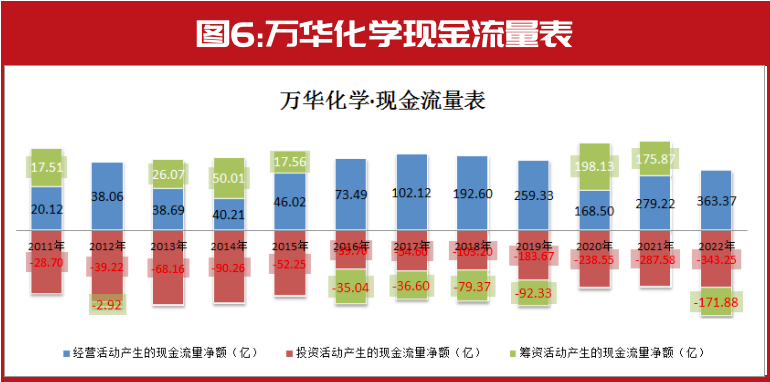 十几年来万华化学的经营活动现金流净额稳定(见图6),具备很强的造血能力,同时,万华化学的投资活动具有自己独特的周期,在投入期,经营活动现金流不能满足投资活动和回报股东或偿还债务。在投资活动较少的时期,经营活动现金流能覆盖投资活动和回报股东或偿还债务。
