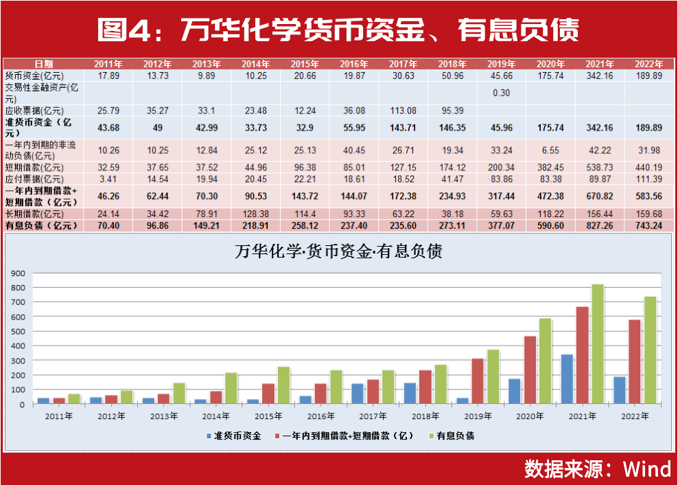 通过万华化学现金和现金等价物+应收票据(主要是银行承兑汇票)和有息负债对比,按照常规财务分析,公司明显的偿债能力不足,现金和现金等价物+应收票据(主要是银行承兑汇票)和短期负债相比,也是显示短期偿债能力不足(见图4)。
