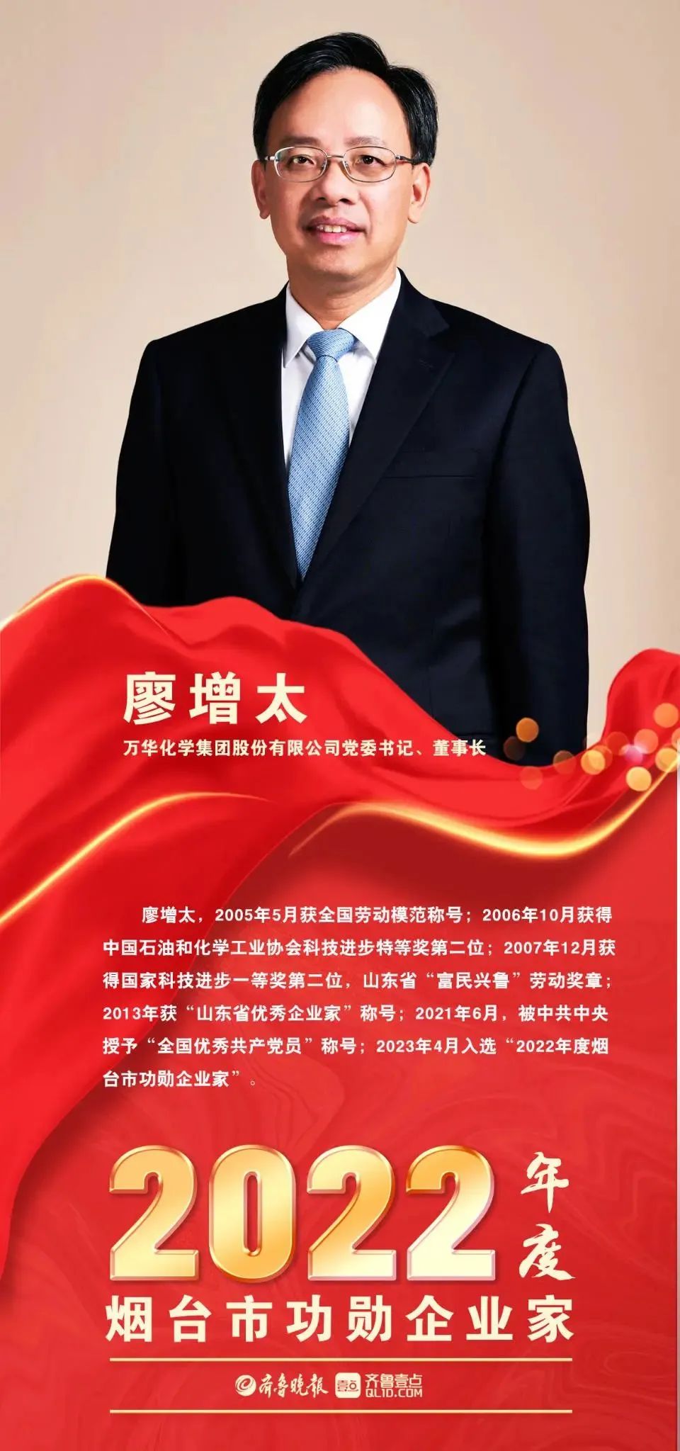 5月17日上午,烟台市2022年工作总结暨优秀企业家表彰大会在烟台国际博览中心召开。会上,烟台市委、市政府对功勋企业家、杰出企业家、创新先锋企业家、优秀青年企业家等予以表彰,万华化学董事长廖增太荣获“2022年度烟台市功勋企业家”称号。
