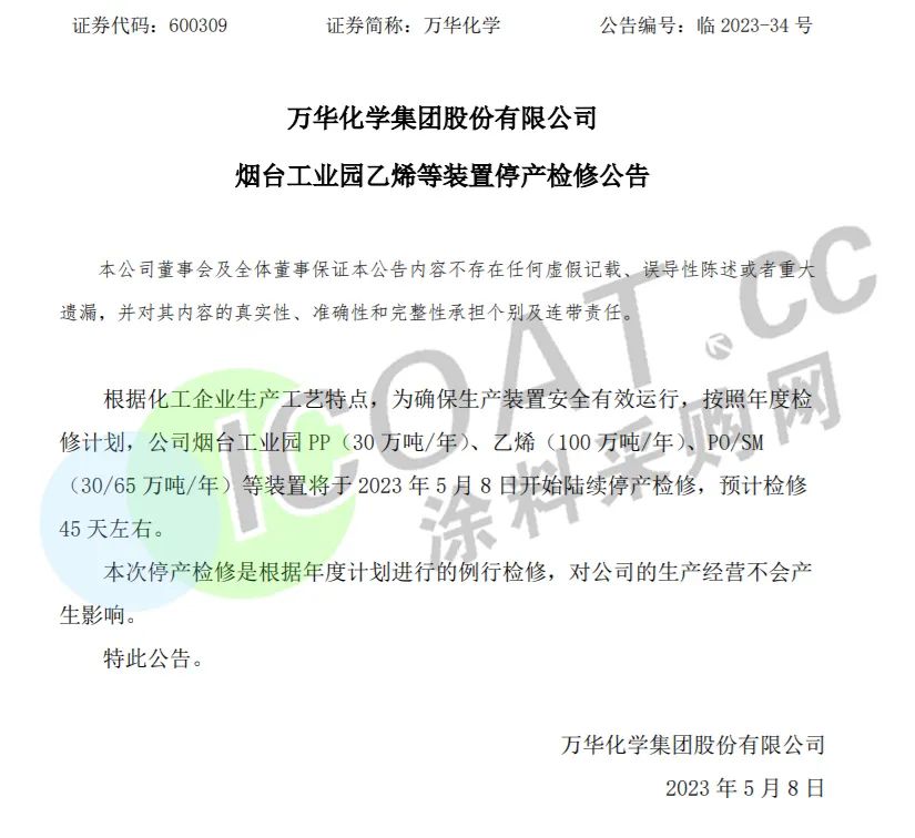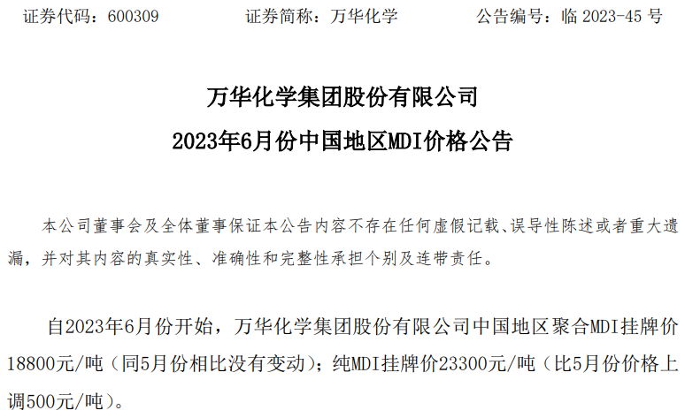 5月31日,万华化学集团股份有限公司发布公告称:自2023年6月份开始,万华化学集团股份有限公司中国地区聚合MDI挂牌价18800元/吨(同5月份相比没有变动);纯MDI挂牌价23300元/吨(比5月份价格上调500元/吨)。