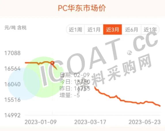 近三个月PC华东市场价跌幅近1500元/吨;