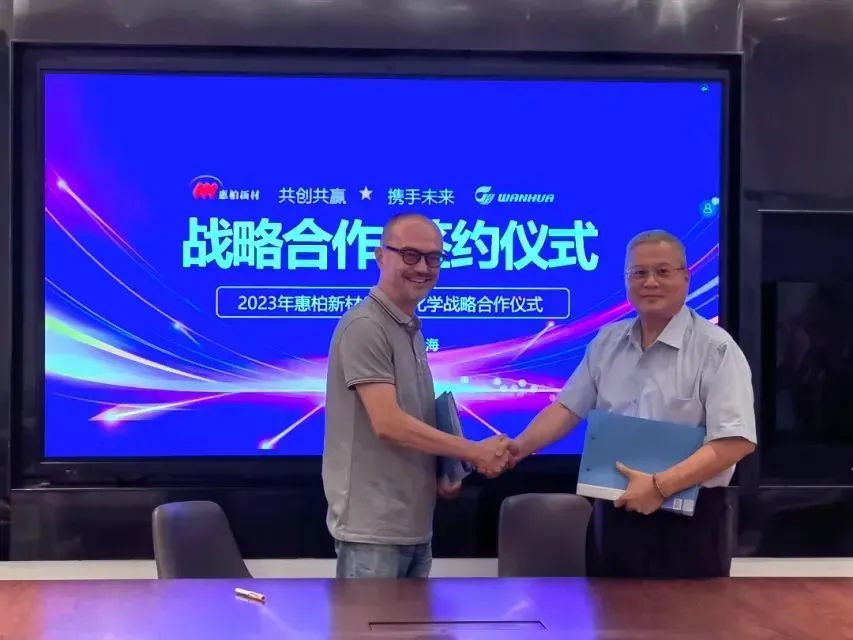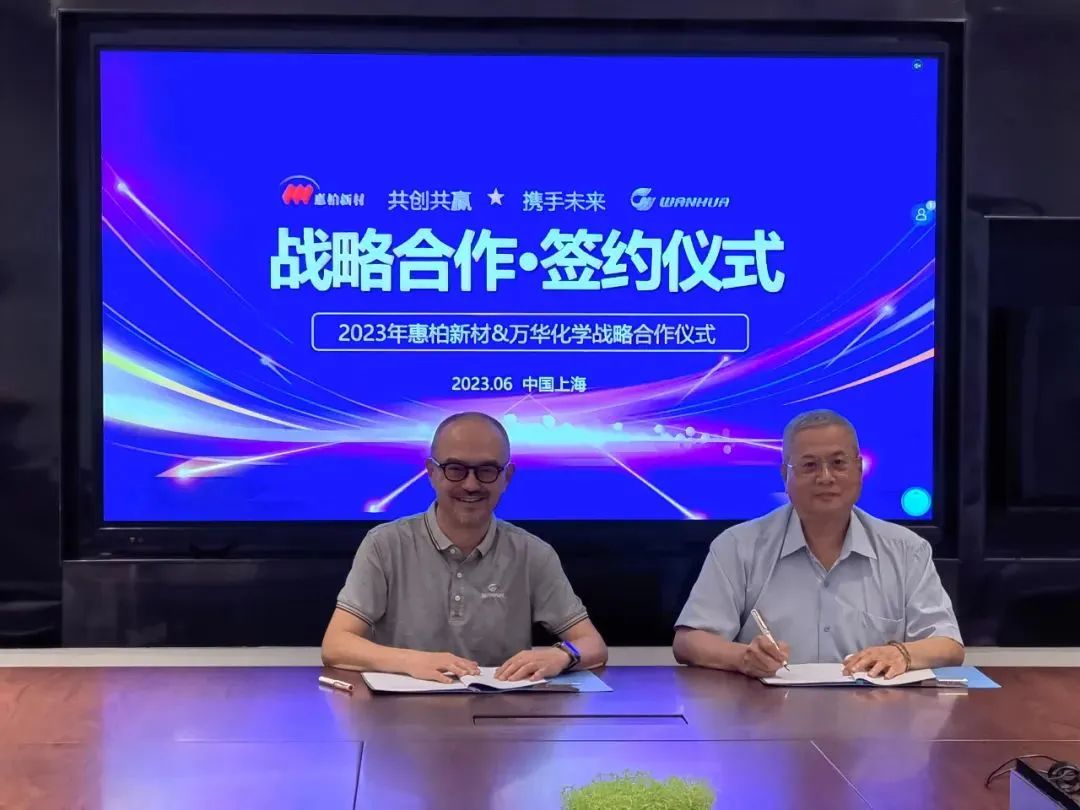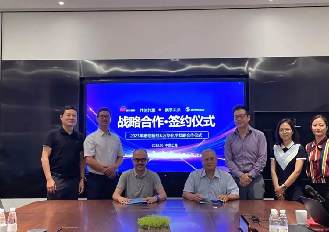 2023年6月19日,惠柏新材与万华化学战略合作签约仪式在惠柏新材总部隆重举行。惠柏新材董事长杨裕镜、总经理康耀伦、采购经理朱严严、采购李雯,功能化学品分公司总经理丁皓博士、功能化学品分公司特种胺及中间体业务部经理刘赵兴博士、和功能化学品分公司特种胺及中间体业务部风电行业经理时昊出席签约仪式。