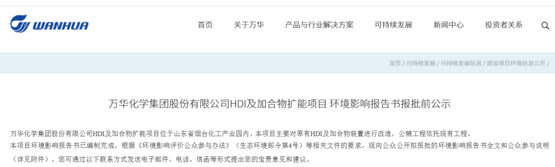 6月30日,万华化学发布HDI及加合物扩能项目环境影响报告书报批前公示。