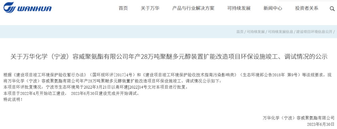 2022年6月1日,烟台市生态环境局就万华化学集团股份有限公司85万吨/年聚醚多元醇扩建项目环境影响评价文件作出审批意见并公示。
