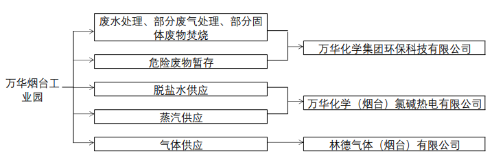 项目位于烟台化工产业园万华烟台产业园内,园区内企业主要包含万华化学集团股份有限公司、林德气体(烟台)有限公司、万华化学(烟台)氯碱热电有限公司、万华化学集团环保科技有限公司、万华化学(烟台)容威聚氨酯有限公司等。林德气体(烟台)有限公司为万华化学集团公司提供氮气和空气;万华化学(烟台)氯碱热电有限公司为万华化学集团公司提供蒸汽;万华化学集团股份有限公司、万华化学(烟台)氯碱热电有限公司热电工厂、万华化学(烟台)容威聚氨酯有限公司废水、固废、废气等主要委托万华环保科技处理。各公司独立管理,单独申请排污许可证。