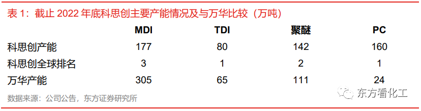 科思创拥有产能包括MDI约177万吨/年,TDI约80万吨/年,聚醚约142万吨/年,PC约160万吨/年,其中MDI产能全球第三,TDI和PC产能全球第一,聚醚全球第二。2022年科思创营业收入超过1300亿元,而万华化学2022年两块业务合计收入约830亿元,科思创的收入约为万华的1.6倍。